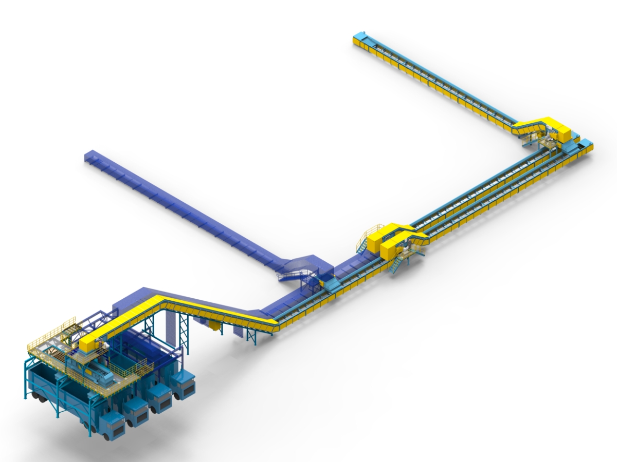 - Distribuição uniforme do sucata em caminhões através de um transportador móvel.